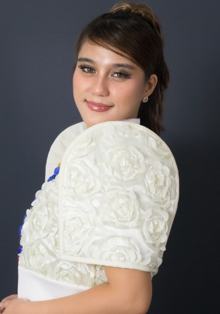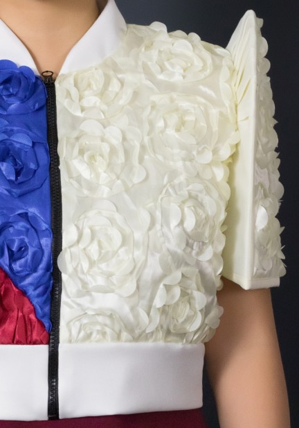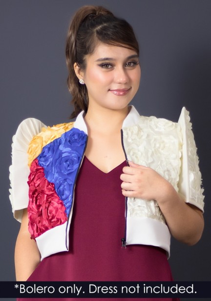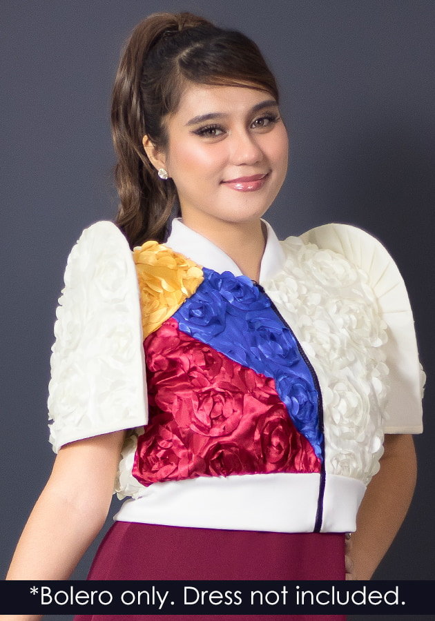 This modern cropped bomber top redefines Filipiniana with a sporty, confident twist — made from lightweight 3d rosette textured fabric, designed with bold color blocks inspired by strength and pride. Designed for women who love culture but live life on the go. Elegant yet dynamic. Perfect to wear for corporate events with a modern Filipiniana theme, smart-casual formal gatherings, creative industry events and launches, fashion-forward photoshoots. Style it with pants or a skirt — this piece is made to move, stand out, and empower!