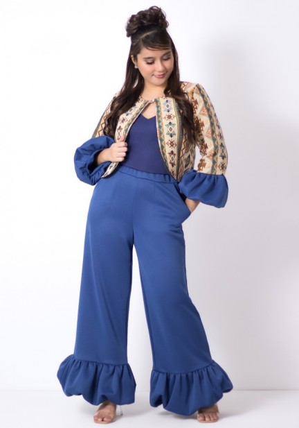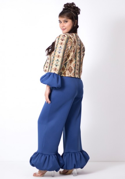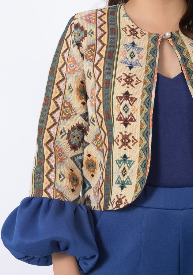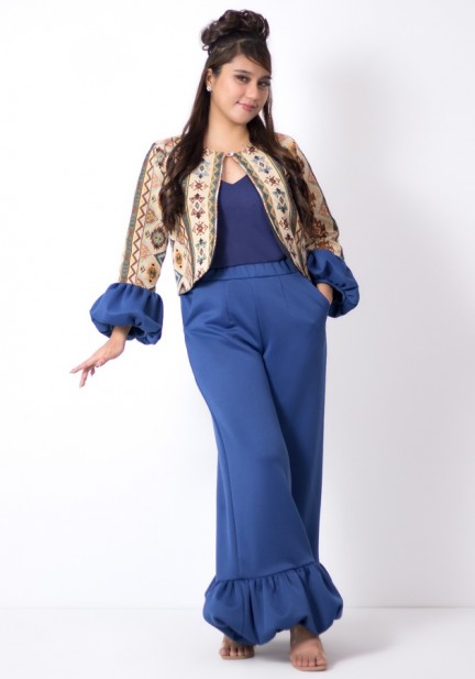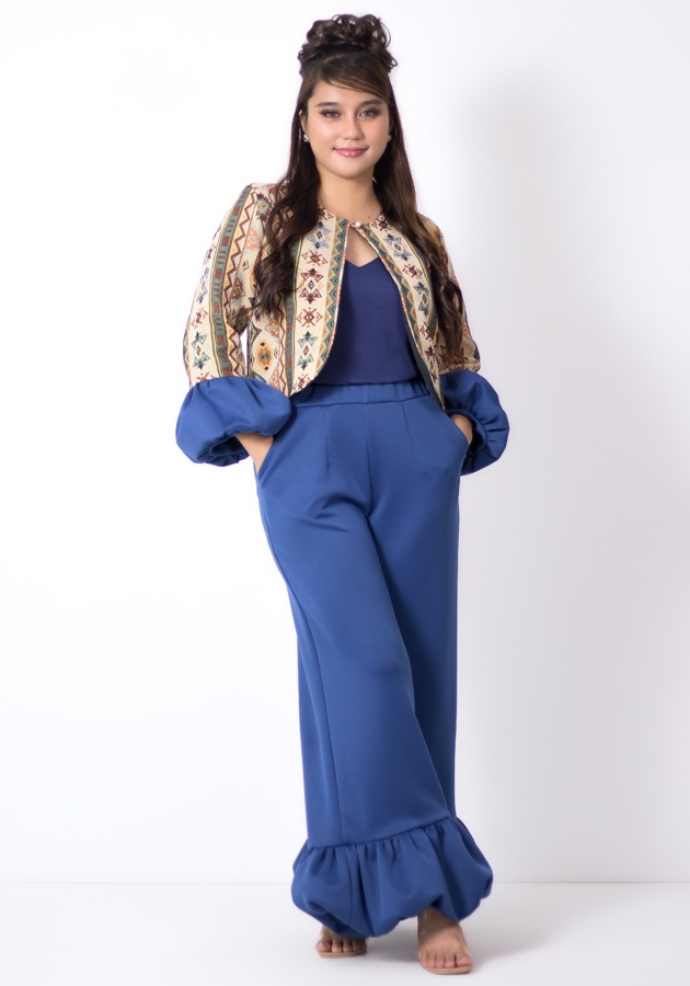 A unique style to add to your wardrobe, this bolero top with bubble sleeves made from brocade fabric, inner cami cotton top, and neoprene pants with bubble hem design gartered at the waist with pockets. Where to wear it? Asean business events or creative meetings, birthday celebrations, stylish brunch dates, fun trips or gatherings. Polished, playful, and powerful — all in one look!