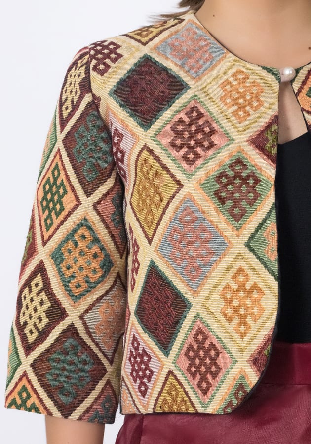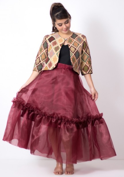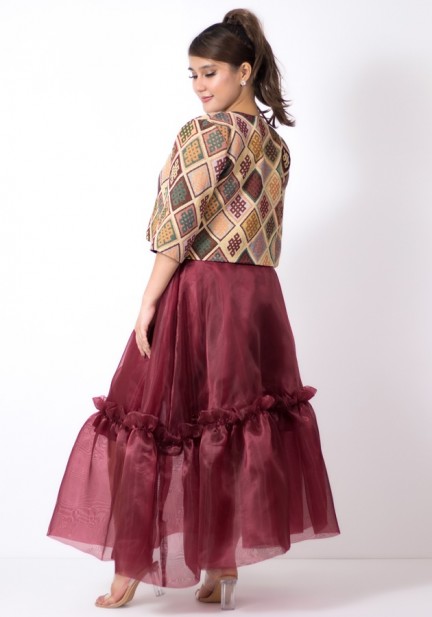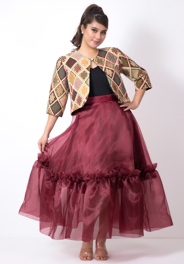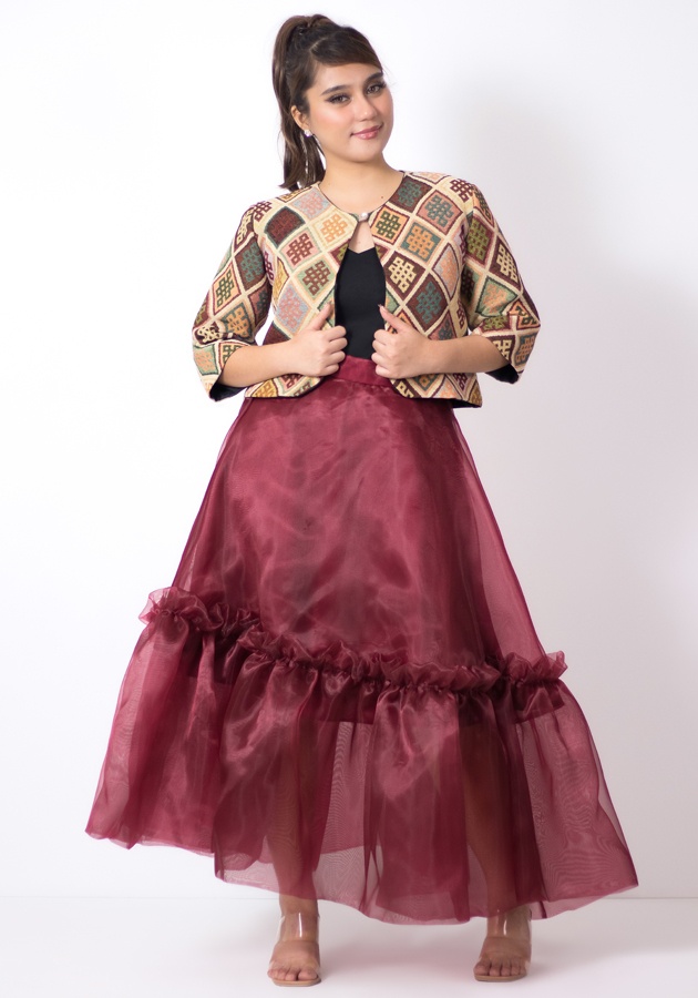 Looking for a standout ensemble for your next big event? Look no further, here's something with a complete Asean charm! Bolero with curved front bottom made from brocade fabric, partnered with a cotton inner cami top and an organza shirred maxi skirt with side zipper and hook & eye closure. Designed for the modern Filipina who dares to stand out with timeless elegance!