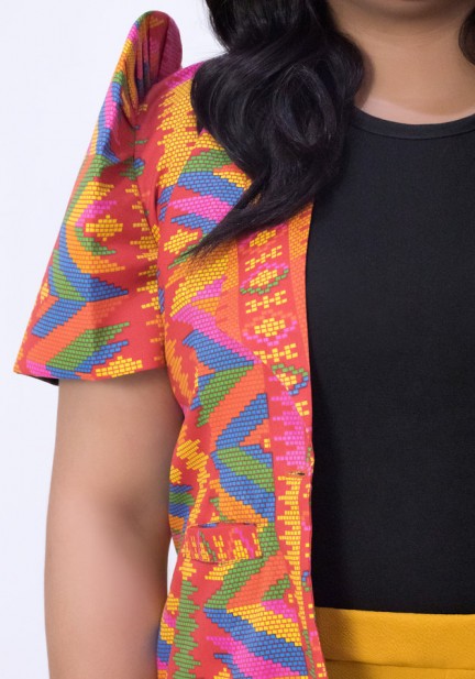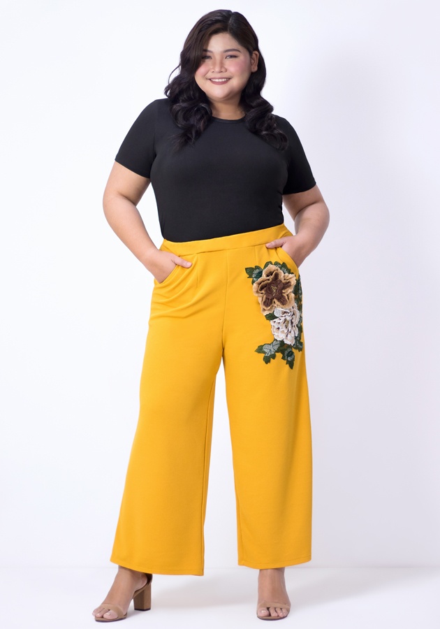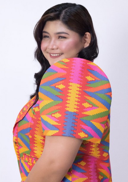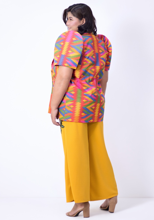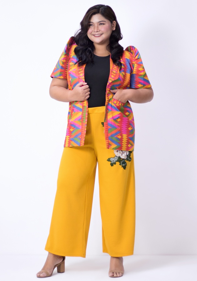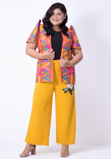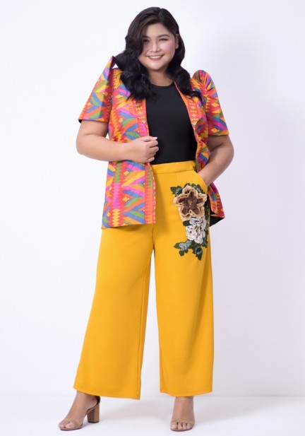 An ensemble that will elevate your Mondays and your smart corporate looks, even cultural gatherings! Filipiniana ethnic blazer made of Chinese woven cloth featuring single fabric button closure and functional slit pockets. Inner top made of comfortable cotton. Pants made of crepe fabric, gartered waist with pockets, patched with floral embroidery. From boardroom to simply making a statement, here's a look that will empower you for hours!