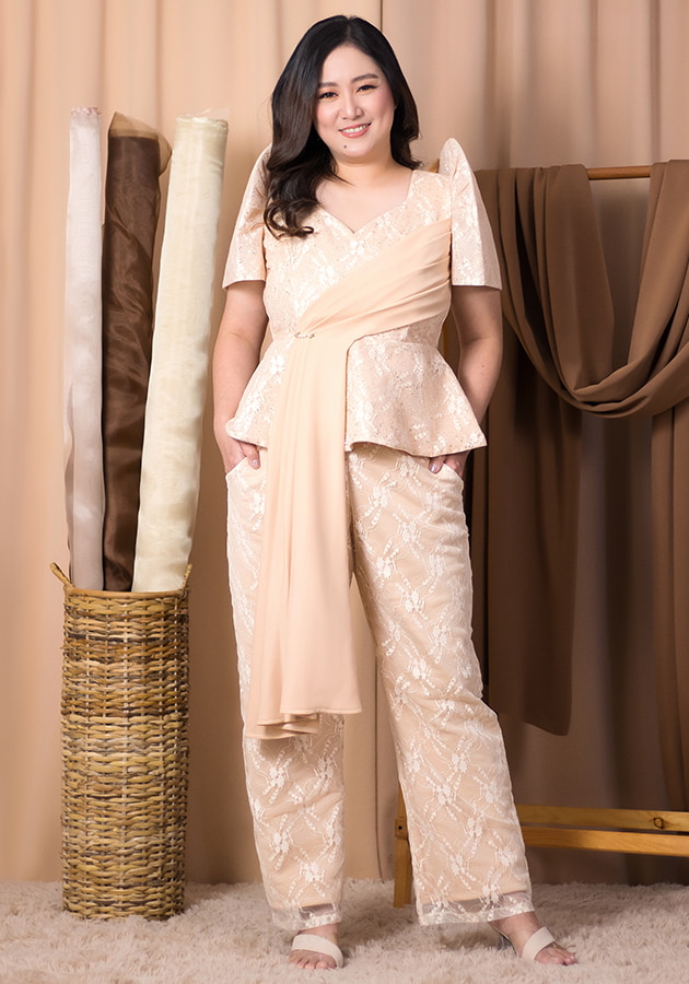 Achieved something? Celebrating a milestone? Attending an important ceremony? This Filipiniana set is calling! Made of neoprene and lace fabrics, the sculpted peplum top defines the waist, zippered at the back, the handcrafted fluid drape creates movement with every step. The laced pants command structure, gartered at the waist with pockets. Perfectly striking without being loud as you walk in composed and sit with confidence. This is power dressing, the modern Filipina way!