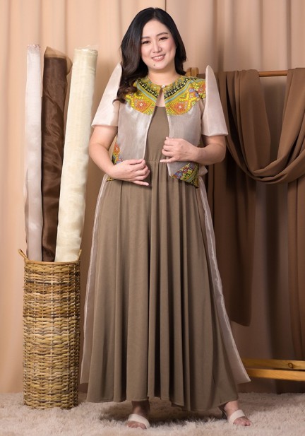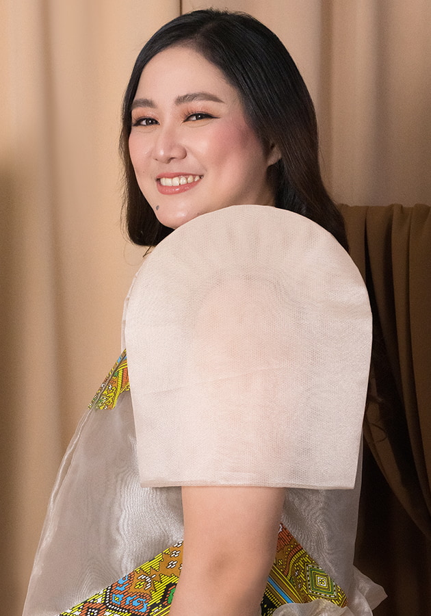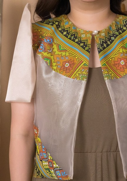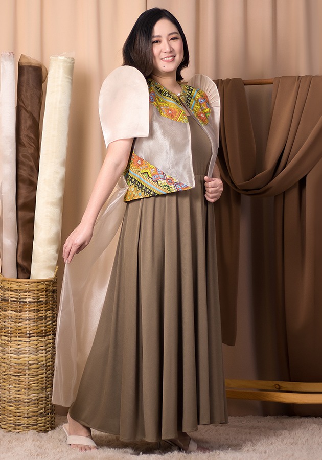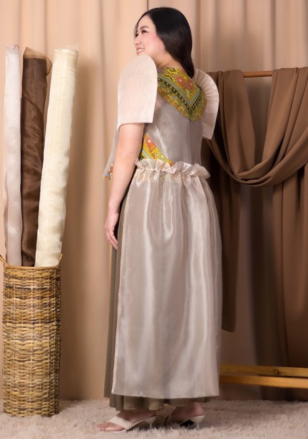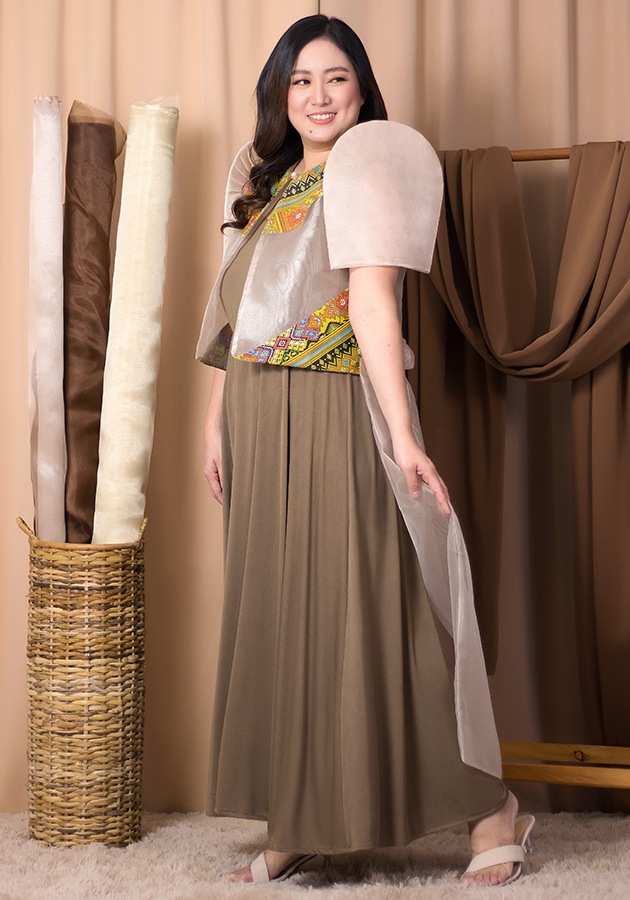 Looking for something that's both striking and charming? Here's a long back organza bolero with ethnic cutout partnered with sleeveless maxi dress made of spandex. For office, cultural events, Asean-inspired ceremonies, a look that bursts with vibrant elegance and joyful pride!