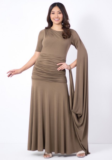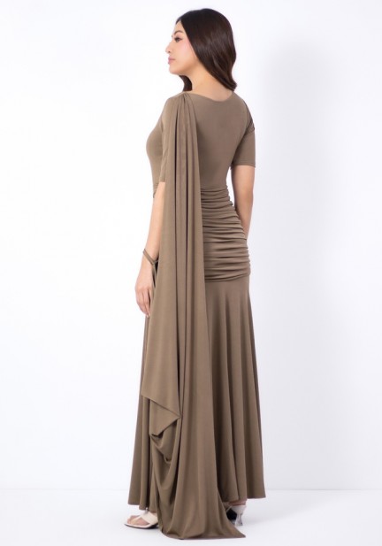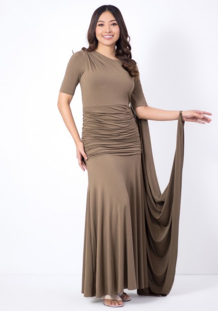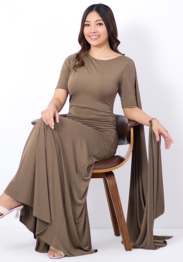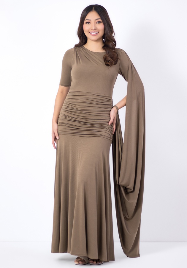 Here's an asymmetric cape drape gown designed for modern elegance. Made from fluid spandex fabric. Why you’ll love it? Modern asymmetrical cape drape for a statement finish, figure-enhancing ruching that flatters without clinging, elegant column silhouette that elongates the body. Graceful, flattering, and timeless — it’s a lovely choice for weddings in the family, wedding guests or sponsors, and formal evening occasions where sophistication matters!