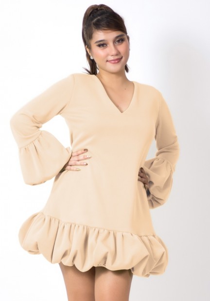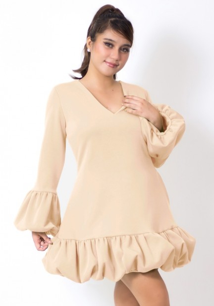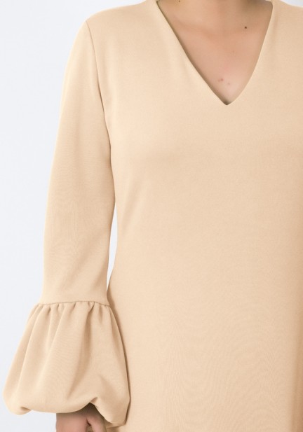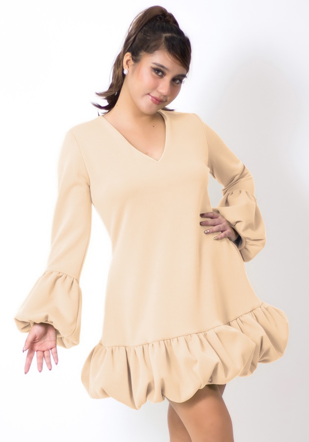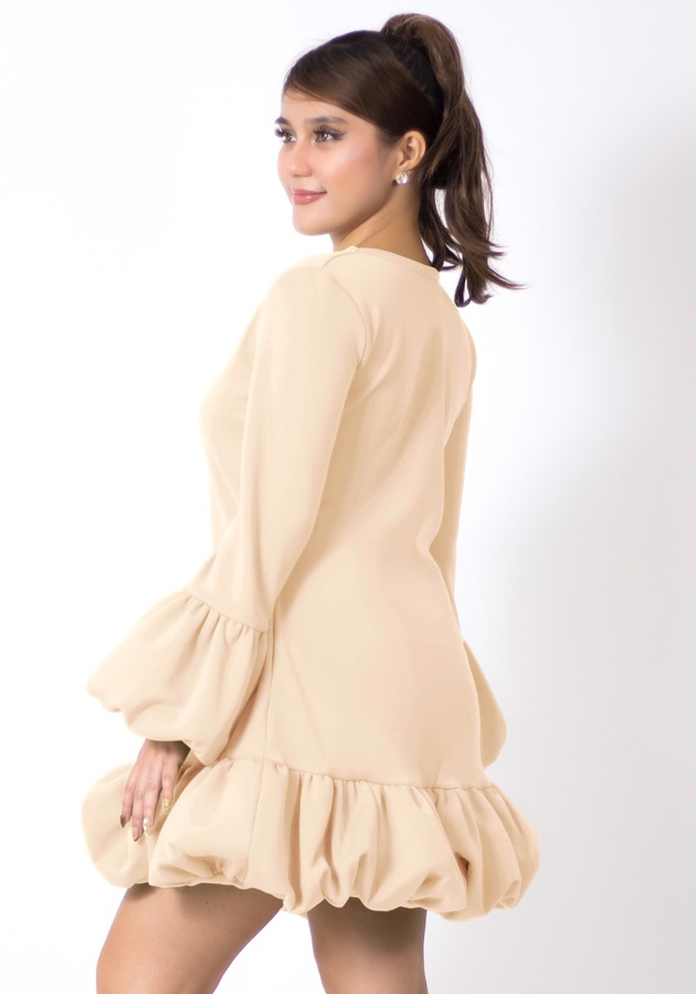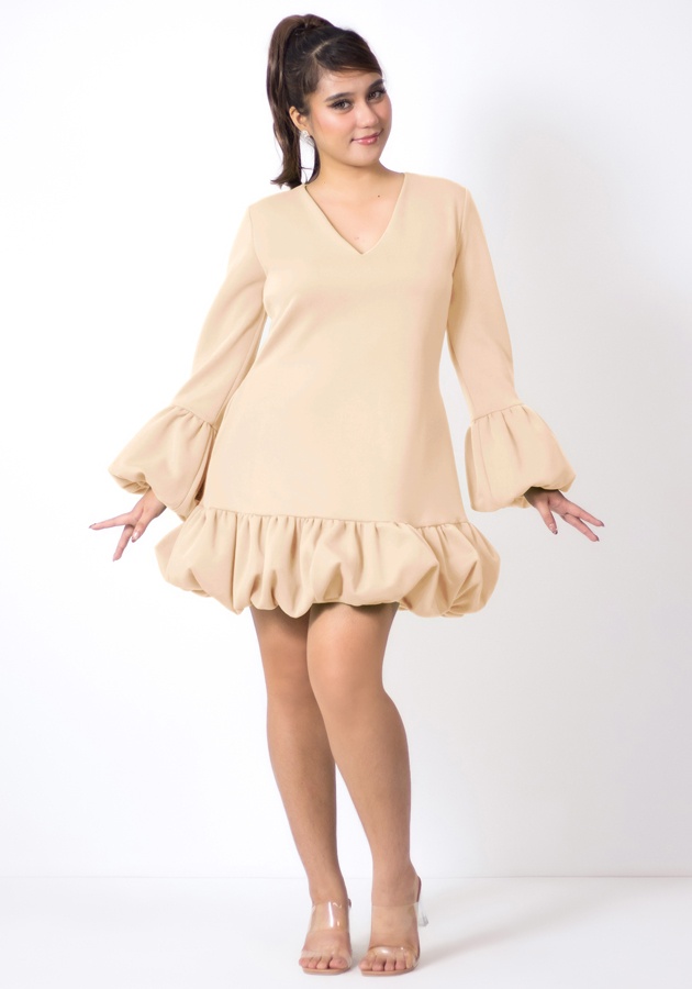 Need a playful party fit? This one's for you! Made of neoprene fabric, elegant V neckline, charming bubble detail at the bottom of sleeves and dress, has secret pockets. Universally flattering silhouette, slightly shorter than regular length. Perfect for celebrations, special gatherings, and memorable beginnings!