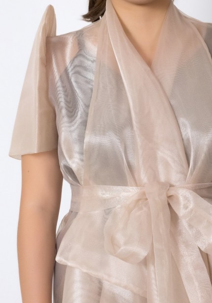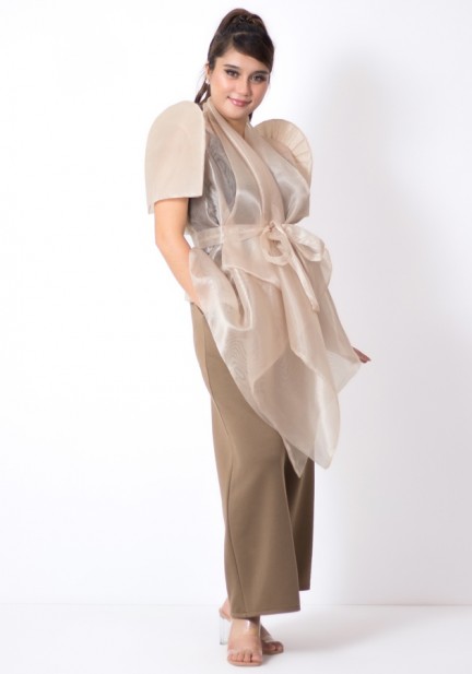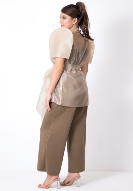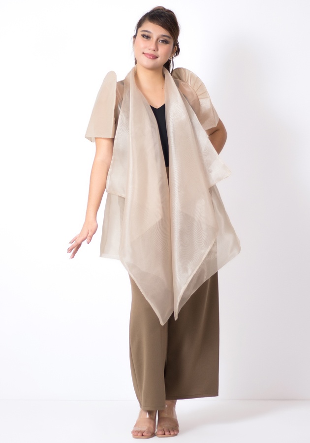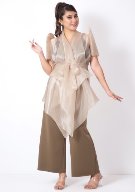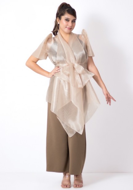 Celebrate tradition with a modern twist in this stunning ensemble, featuring an inner cami top, pants, and a Filipiniana sleeved wrap kimono shaped with a waist tie. Crafted from cotton (inner top), neoprene (pants), and organza (wrap top) fabrics, this outfit strikes the perfect balance between elegance and style. Its mix-and-match versatility allows you to effortlessly curate different looks, making it a practical yet sophisticated choice for weddings, formal events, ceremonies, or any special occasion!