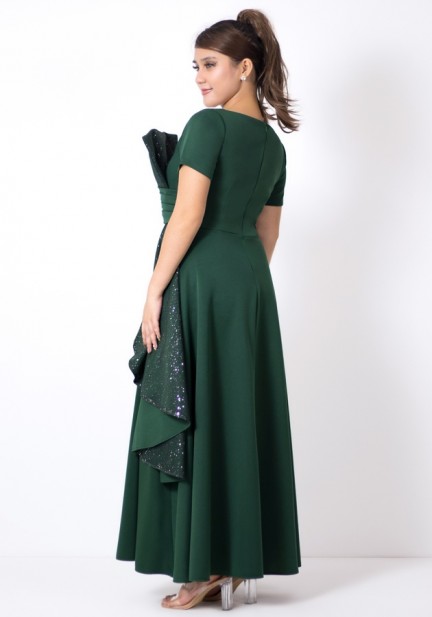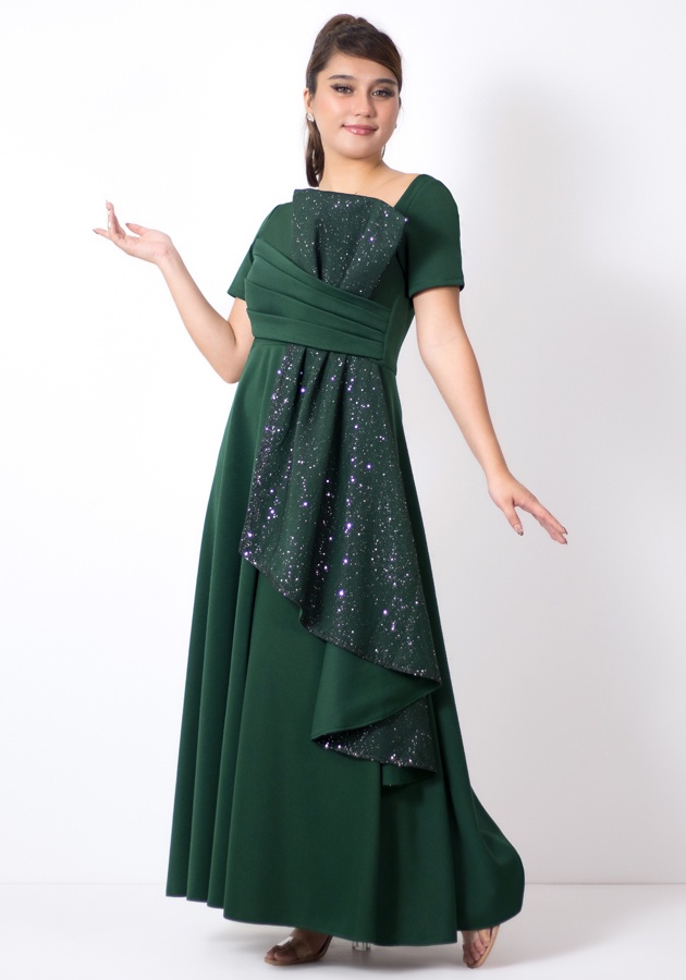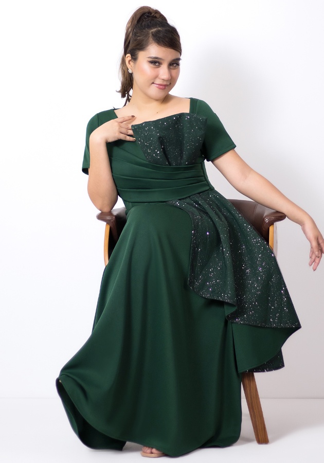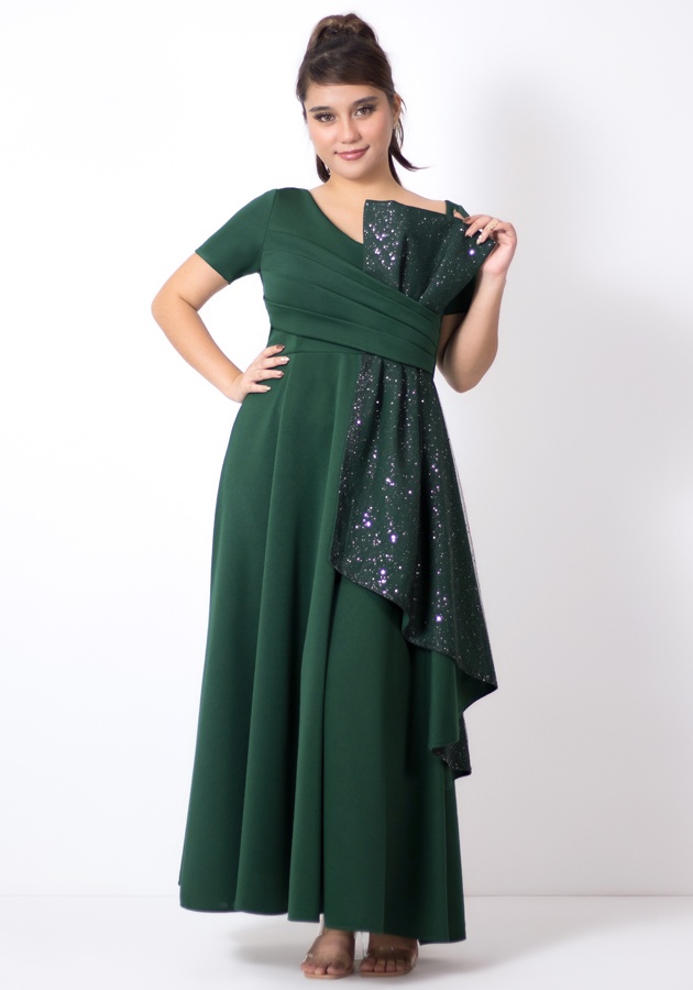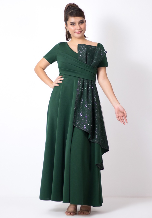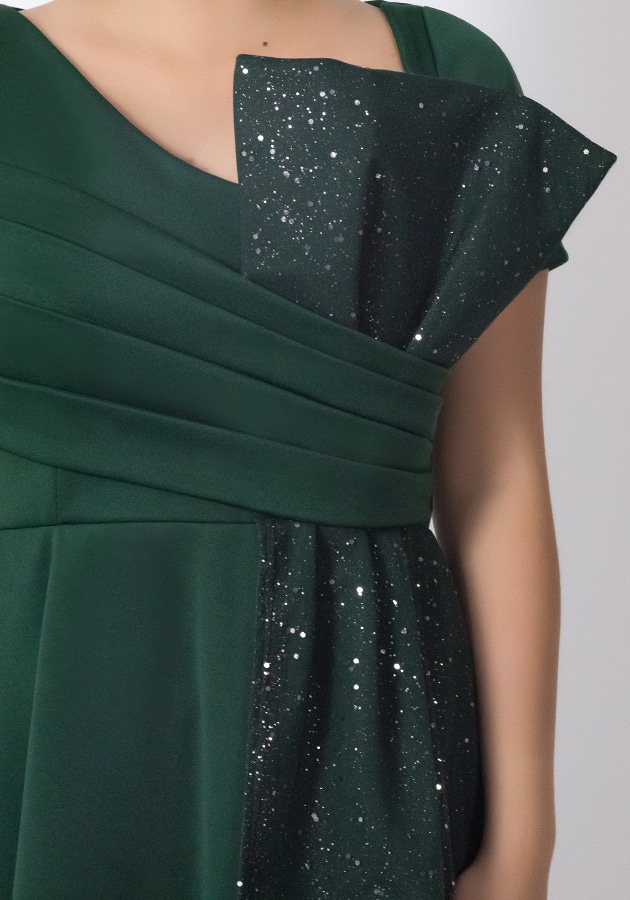 Step into the event spotlight with this stunning statement piece that exudes glam, elegance, and grace. Designed for the modern muse, this gown is zippered at the back, features asymmetric neckline with bow and drape made of glittery tulle, delicately catching the light with every move. The dress is crafted from neoprene, ensuring a flawless flow and letting you feel as fabulous as you look!