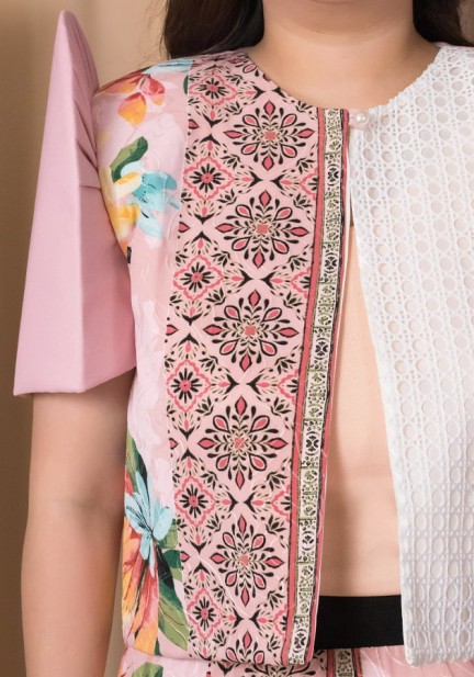 This Asean inspired ensemble boasts of luxurious fabric combination and refined details. Bolero Filipiniana crafted from spandex, solihiya weave pattern lace, and chiffon. Skirt made of spandex, gartered at the waist and has side slits. Cotton inner cami top. A well put-together look, whether you're going to the office, attending cultural celebrations, or any Asean inspired events!