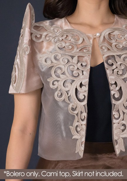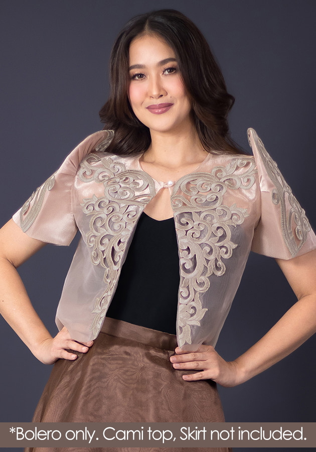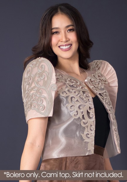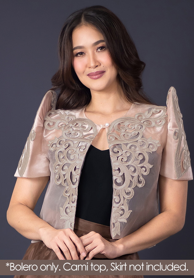 Elegance with depth, simply empowered — that's what this bolero Filipiniana is exuding. Made from organza fabric with exclusive cutwork design, single pearl closure. For classy celebrations, oathtaking, ceremonies, Filipiniana-coded events, here's a look that commands quiet confidence and enormous amount of class!