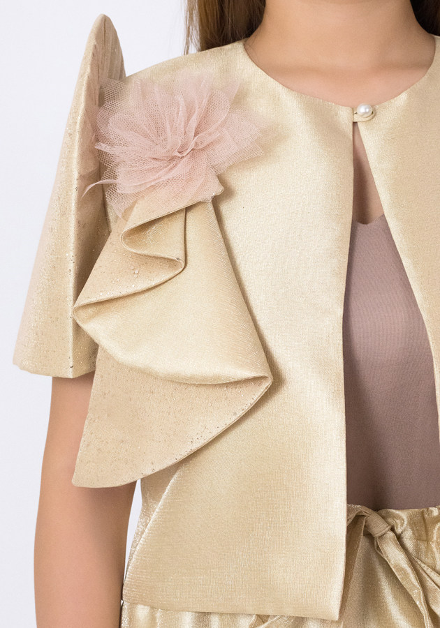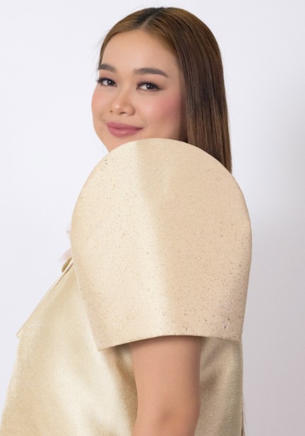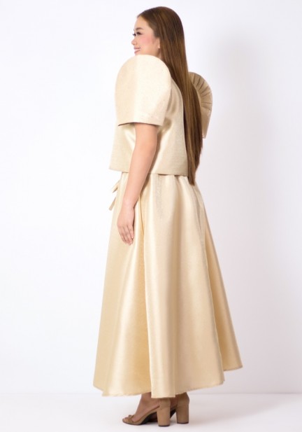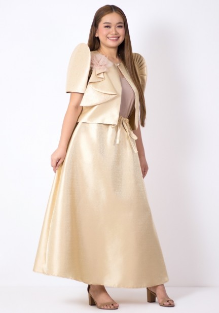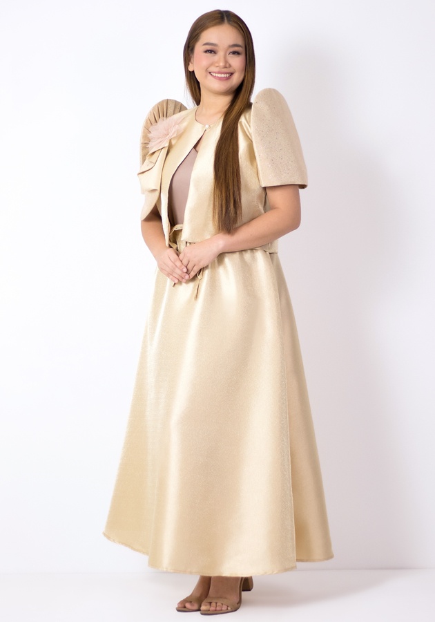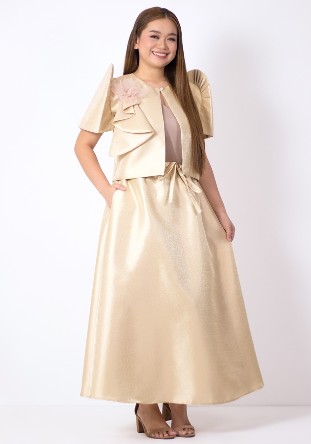 Undeniably elegant, this bolero Filipiniana and maxi skirt ensemble is designed to be loved during weddings, formal ceremonies, and cultural celebrations. Crafted from shimmering metallic gazar, the bolero features classic Filipiniana sleeves that shimmer and glitter, elevated by a graceful drape embellishment and a statement corsage flower. Paired with a maxi skirt, tie at the waist, hidden pockets. A soft cotton inner camisole makes it all-day comfortable. Step into any Filipiniana-themed event in a look that’s brilliantly styled and culturally inspired.