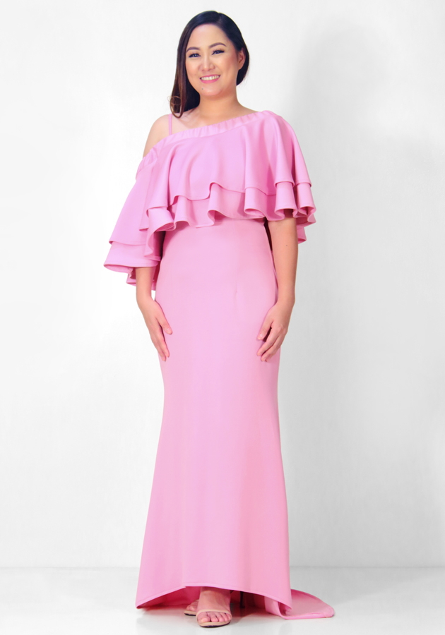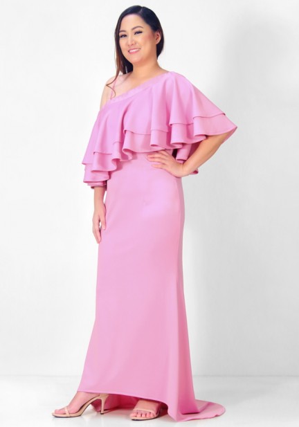 The event of the year calls for nothing less than your most stunning look, so we confidently suggest this double layer one shoulder trail gown for you. Neoprene fabric, gartered waist. You are so ready to attend the grandest gathering ever!