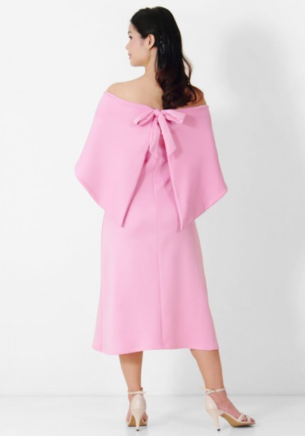 Elegance and simplicity combine effortlessly in this off-shoulder layer cape dress. Made in neoprene fabric, features adjustable ribbon tie and zipper closure at the back. A fit to A-line silhouette, lovely midi length dress just right for your special parties, ceremonies, and events. A simply stunning piece bound to be one of your most treasured closet items!