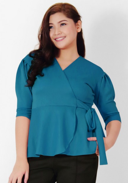 Accommodate every occasion with this overlap peplum top. Neoprene fabric, features puff sleeves and side waist tie. It’s classic and ultra feminine, you can partner to your favorite pants and off you go in confidence all day long!