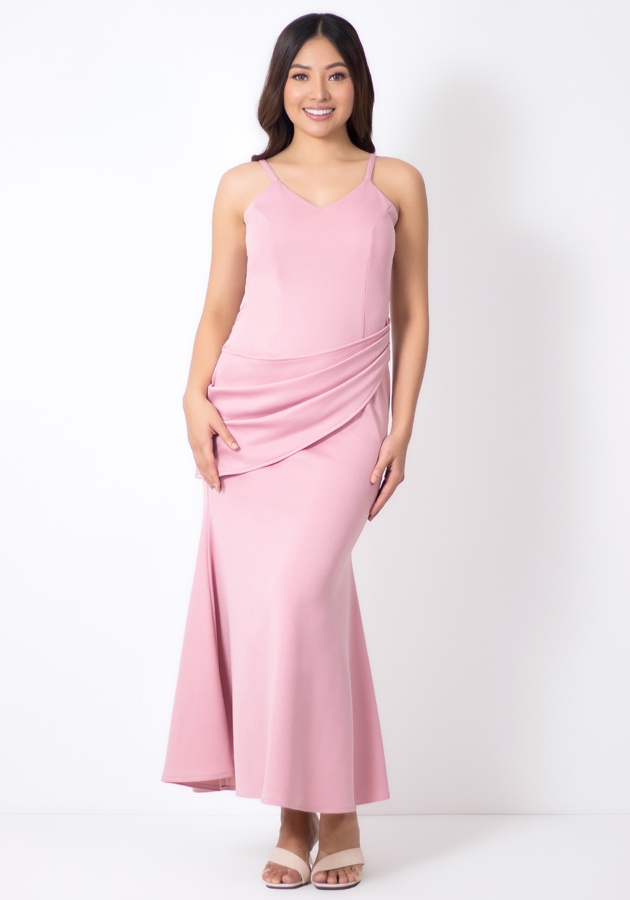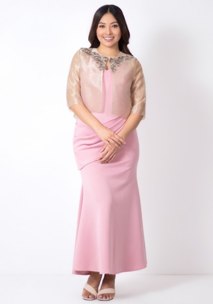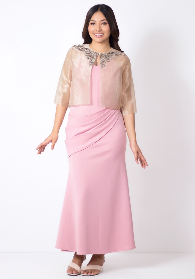 Polished, carefully thought of, timeless. This look features an inner thin strapped flared bottom gown made of neoprene, designed to flatter your figure, paired with a sheer organza bolero overlay delicately finished with embroidered patch detailing. Photographs beautifully, perfect for highlight events, wedding sponsors, mothers of the bride, formal evenings, and milestone celebrations!