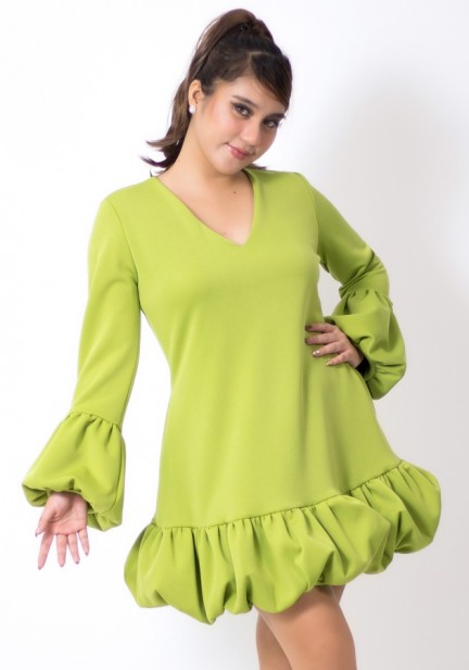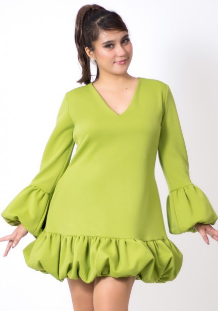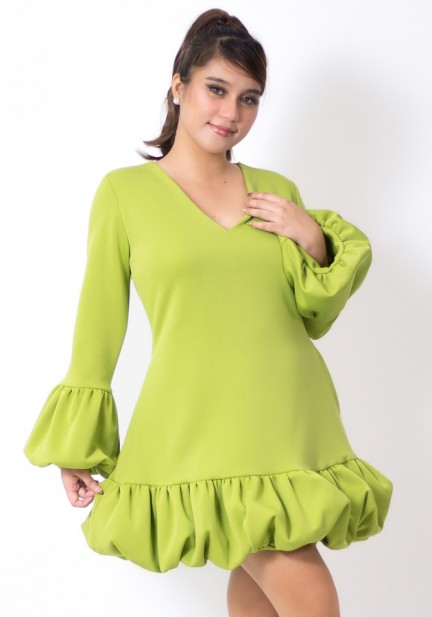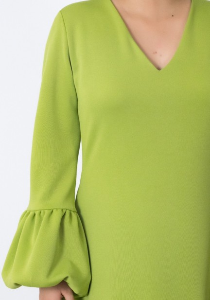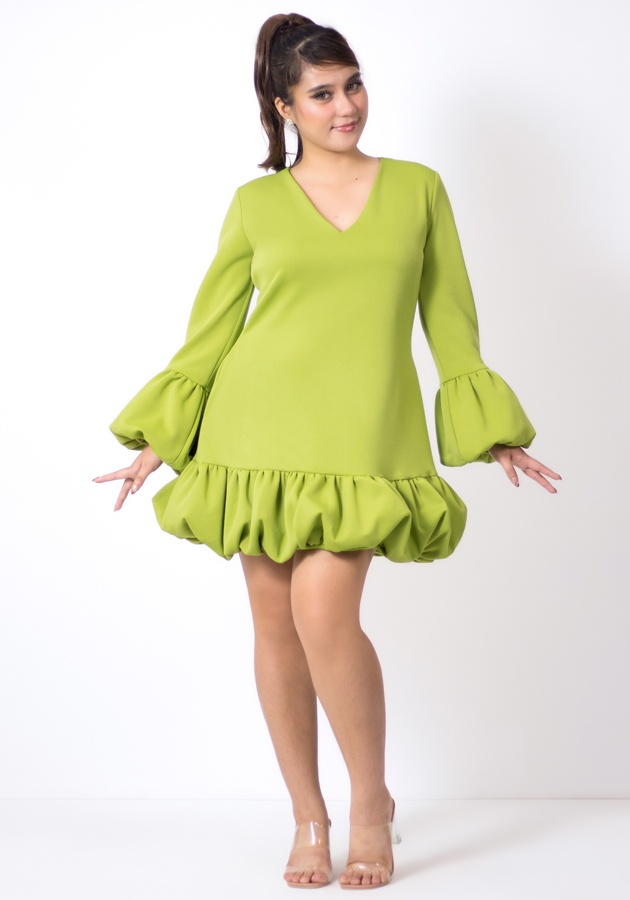 Need a playful party fit? This one's for you! Made of neoprene fabric, elegant V neckline, charming bubble detail at the bottom of sleeves and dress, has secret pockets. Universally flattering silhouette, slightly shorter than regular length. Perfect for celebrations, special gatherings, and memorable beginnings!
